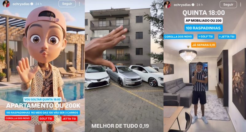 O mundo digital da ostentação e dos sorteios online de luxo colidiu com uma investigação de grande porte da Polícia Federal na última quarta-feira (15). Horas antes de ser detido na Operação Narco Fluxo, o influenciador digital Chrys Dias, que acumula mais de 14 milhões de seguidores em suas plataformas, promovia em suas redes sociais uma rifa inusitada: um apartamento ou R$ 200 mil, com bilhetes a meros R$ 0,19. Essa mesma prática de sorteios, com prêmios de alto valor a custos irrisórios, tornou-se o epicentro da investigação que apura um complexo esquema de lavagem de dinheiro.